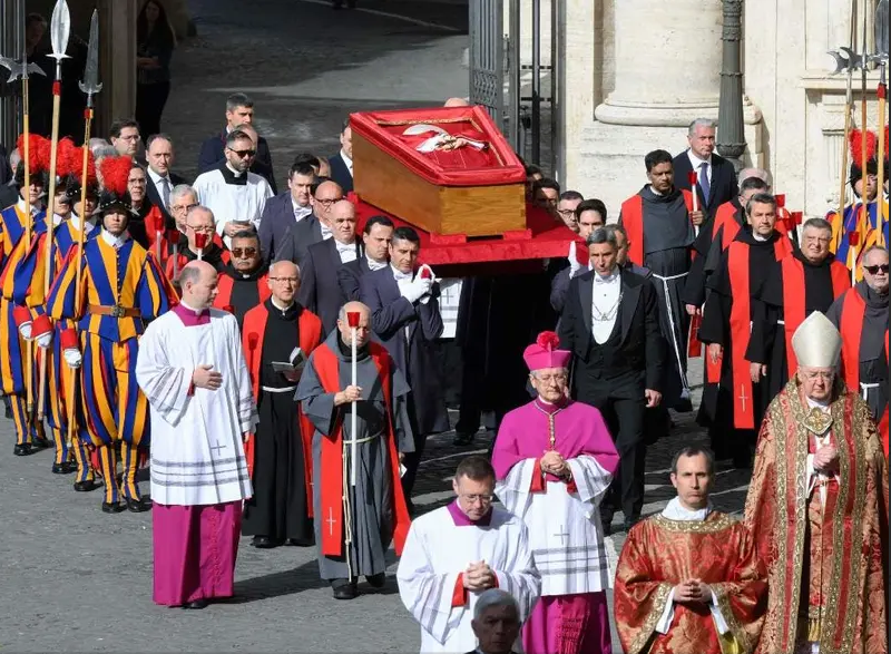 Finalmente, el Cardenal Re asperjará con agua bendita el cuerpo del Papa Francisco y lo incensará mientras se entona un responso. Al concluir, tras una última oración a cargo del decano del Colegio Cardenalicio, el féretro será nuevamente trasladado dentro de la Basílica de San Pedro, al tiempo que se entona el Magníficat.