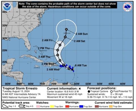 El NHC, con sede en Miami, prevé que Ernesto se mueva esta mañana a lo largo de partes de las Islas de Sotavento, y por la noche cerca de Puerto Rico y las Islas Vírgenes estadounidenses y británicas.