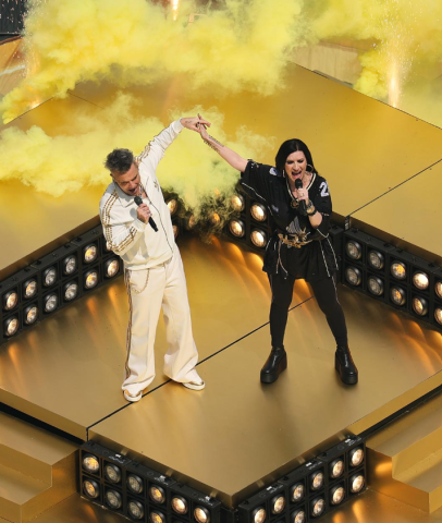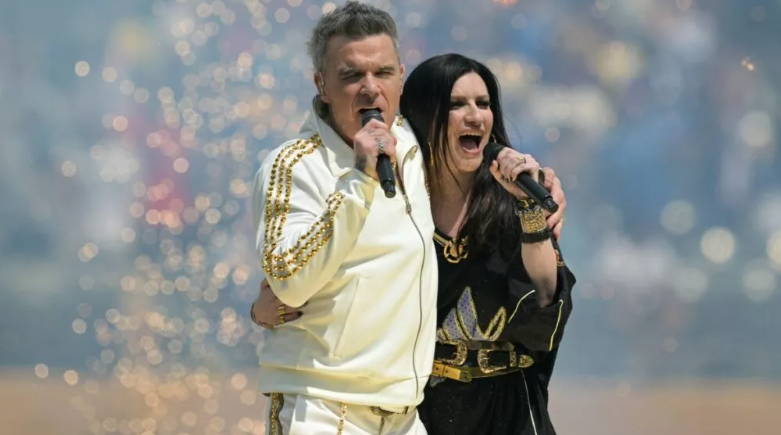 Vestido de blanco con detalles dorados, Robbie Williams irrumpió en el escenario con su habitual energía, mientras que Laura Pausini, deslumbrante de negro, aportó emoción e identidad al interpretar parte de la canción en español, conectando con un público global que seguía el evento desde todos los rincones del planeta.