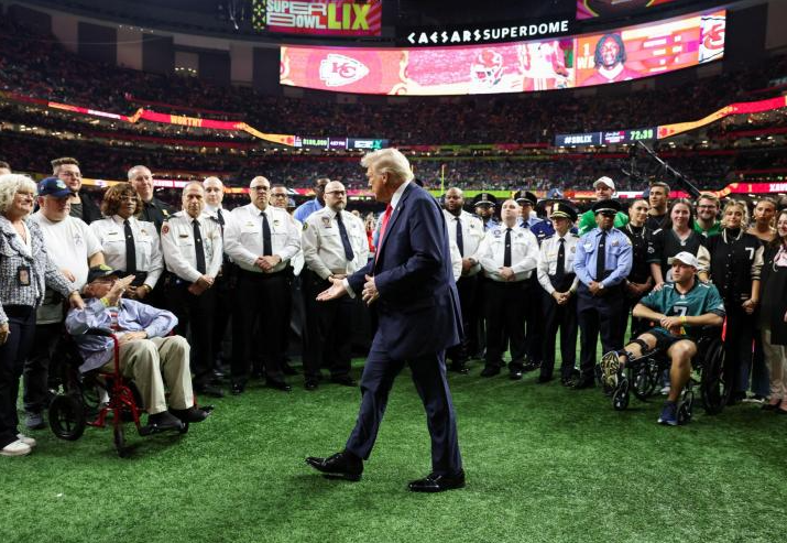 Al llegar al estadio, Trump pisó el césped en el que jugarán los Kansas City Chiefs y los Philadelphia Eagles el Super Bowl LIX, antes de acceder a su zona reservada.